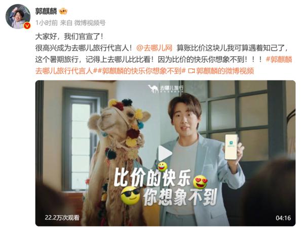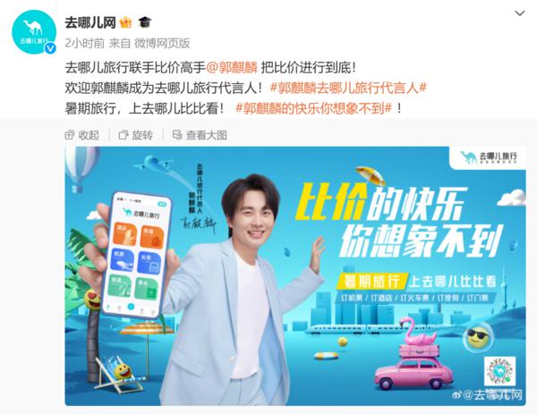 7 月 11 日上午,去哪兒網正式官宣品牌代言人郭麒麟(明星代言公司),對此,去哪兒黃小杰表示," 郭麒麟的影視作品多是能比會算的角色,而去哪兒一直以來的使命就是幫助用戶省錢,花得更少,玩得更好。"