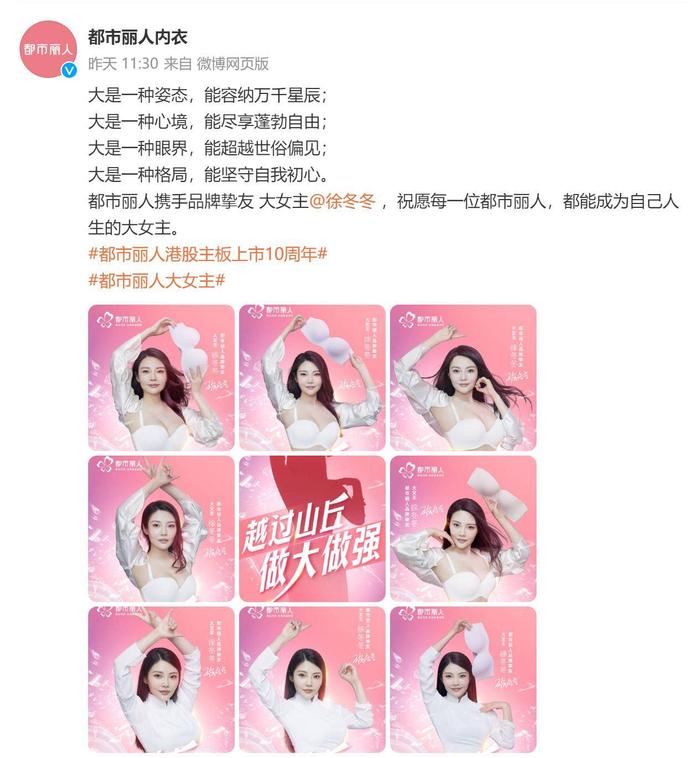 今年是都市麗人創(chuàng)辦的第26周年,港股主板上市10周年,在這個(gè)特殊的時(shí)刻,都市麗人將欣賞和信賴的目光放在徐冬冬的身上,足可見得品牌對(duì)于徐冬冬的認(rèn)可和喜愛。在品牌官宣當(dāng)日,都市麗人發(fā)布了徐冬冬的“大女主”代言寫真,寫真中,徐冬冬以簡約自信的形象展示著女性的自在與舒適,氣場(chǎng)全開的她與品牌語言和氣質(zhì)契合度超高。