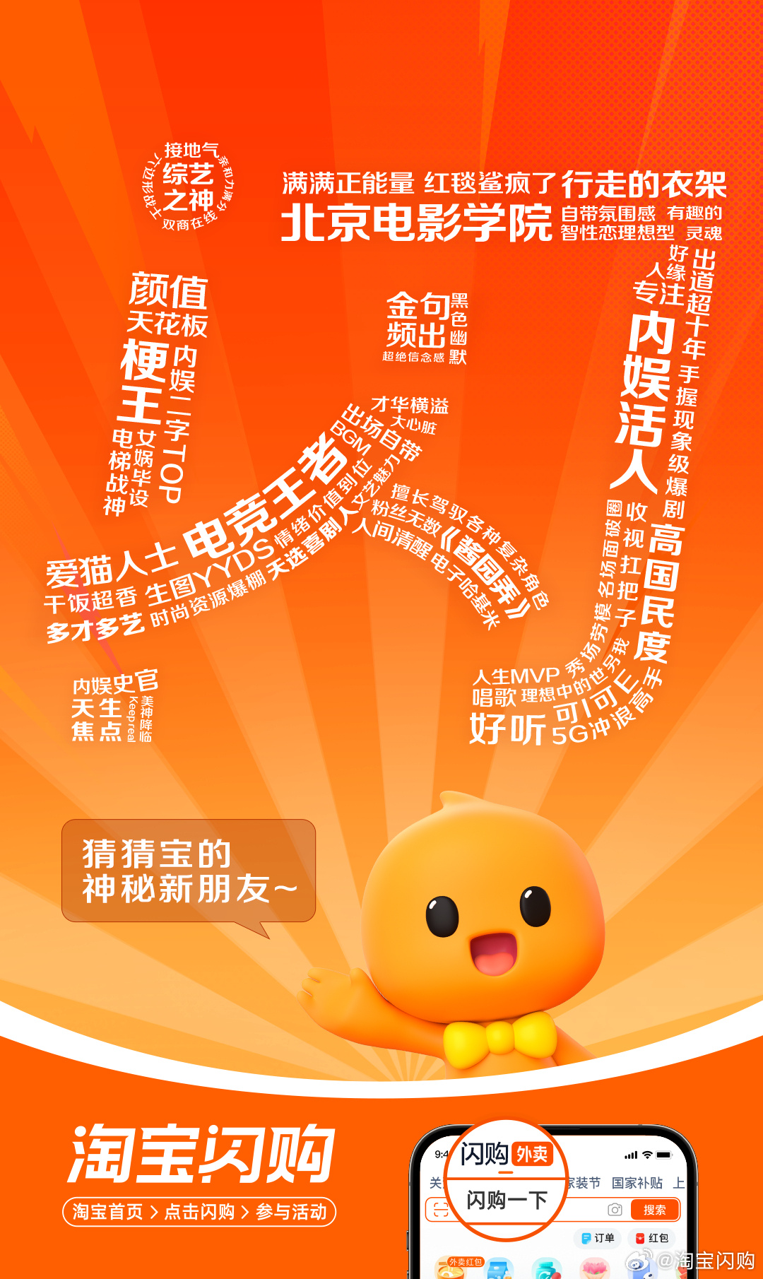 而在此之前,淘寶閃購發(fā)布了一張海報,通過各種關(guān)鍵詞組成的「閃」字,為兩位代言人官宣拉滿話題度。