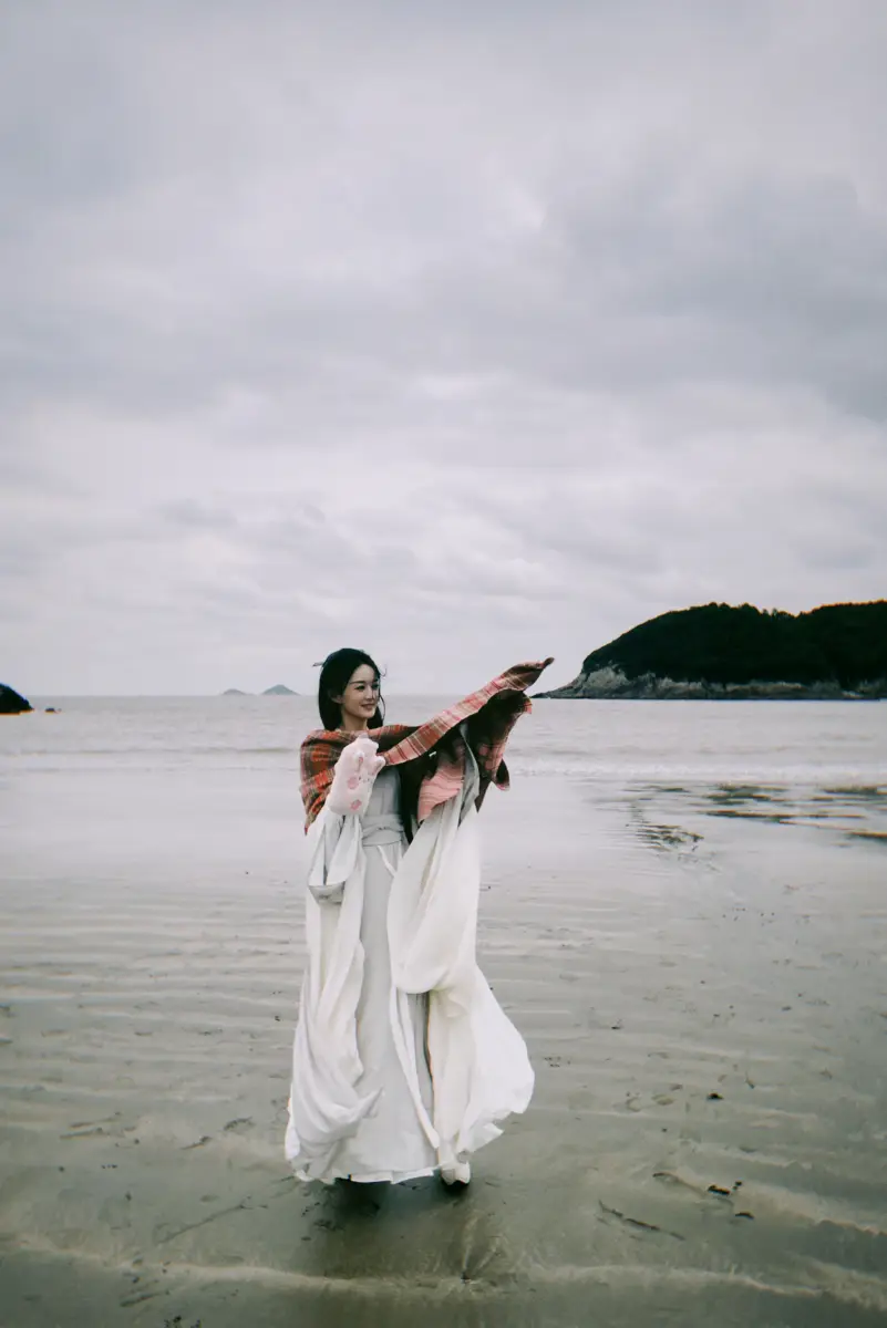 趙麗穎古裝立于沙灘上 抬頭望向天空眼神有戲