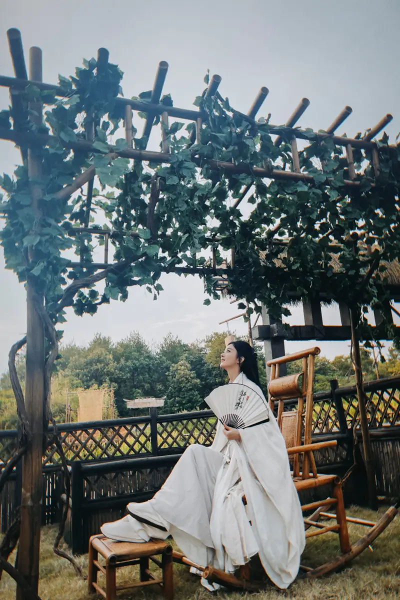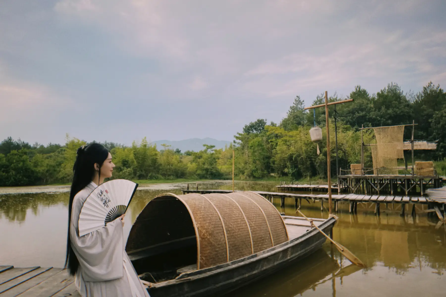 趙麗穎靠坐在古船上。