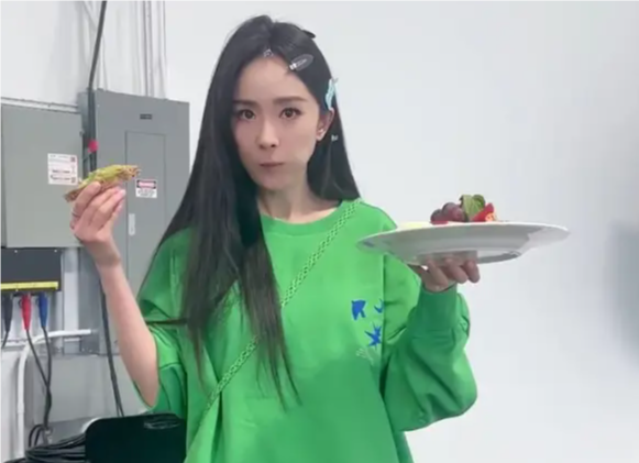 楊冪工作前大口吃番茄 穿格子衫單腳立活潑可愛