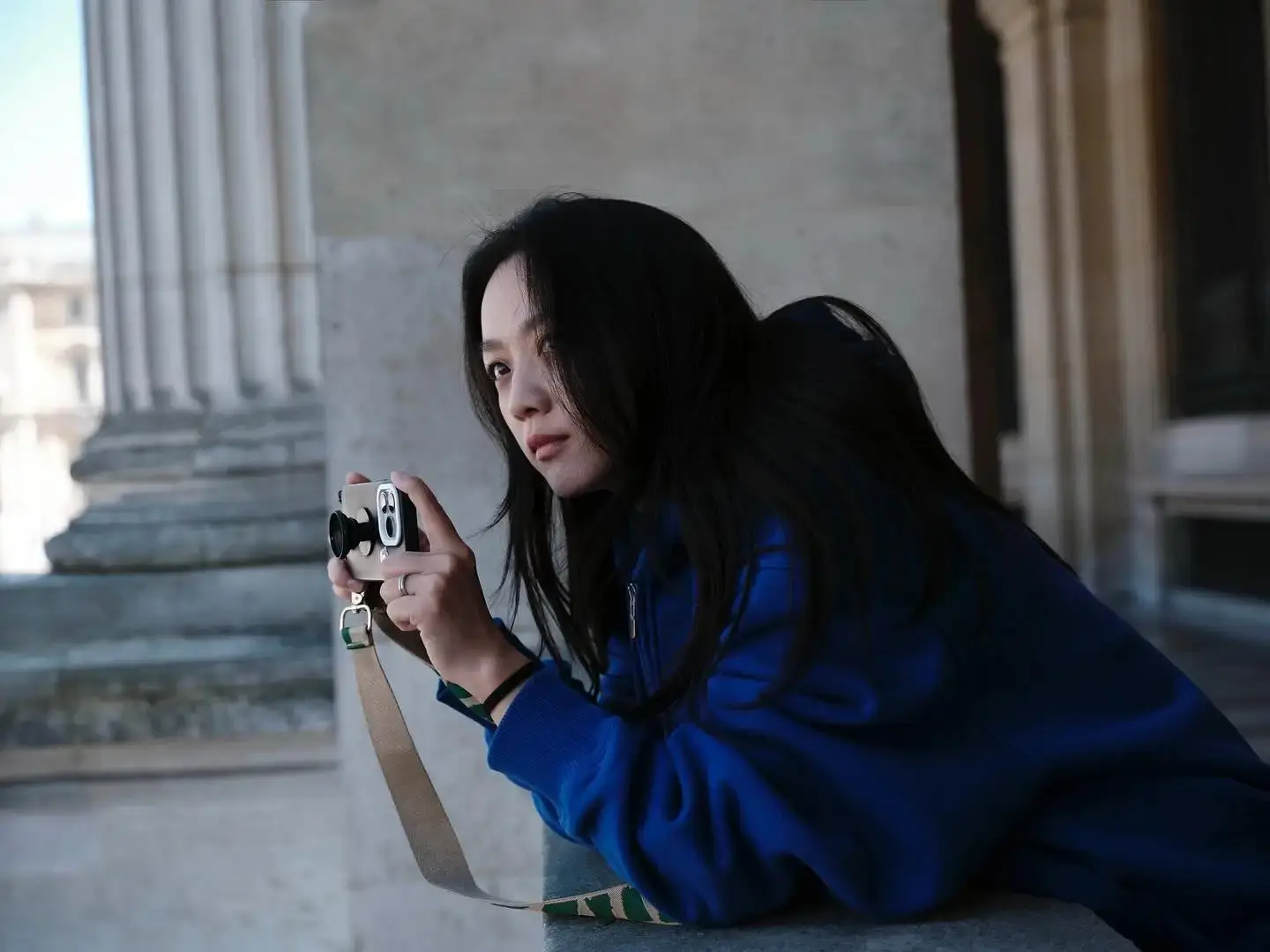 湯唯穿藍(lán)衣白鞋漫步巴黎 手持相機(jī)慵懶自在