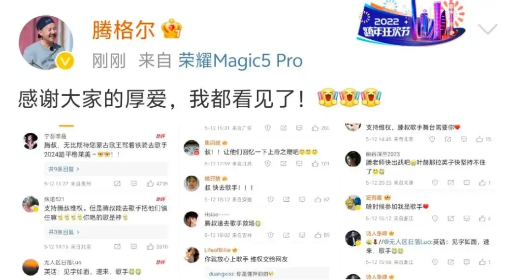 5月12日,騰格爾在個人社交賬號發(fā)文,回應了網(wǎng)友們喊話他上《歌手》的請求,并表示:感謝大家的厚愛,我都看見了。