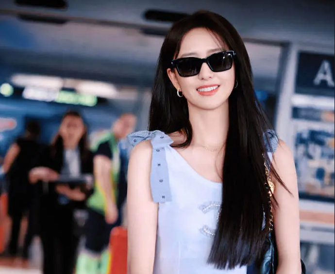 佟麗婭抵達戛納尼斯機場 穿藍色吊帶松弛感十足