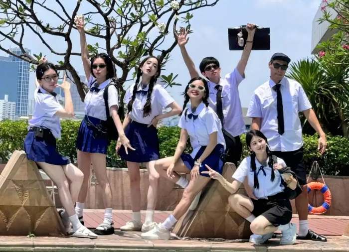 4月18日,綜藝《花兒與少年》嘉賓秦嵐、辛芷蕾、趙昭儀、胡先煦、江疏影、娜扎、楊佑寧穿校服合影,大家姿勢(shì)搞怪可愛(ài),青春氣息滿滿。