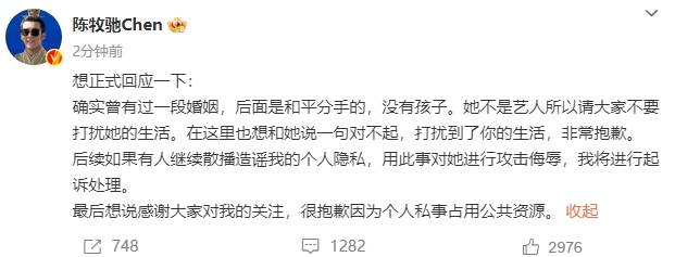 陳牧馳發(fā)文承認曾經(jīng)離婚:和平分手 沒有孩子