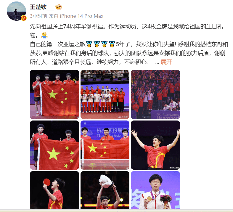 王楚欽發(fā)長文回應(yīng)獲金牌:這4枚金牌是我獻給祖國的生日禮物