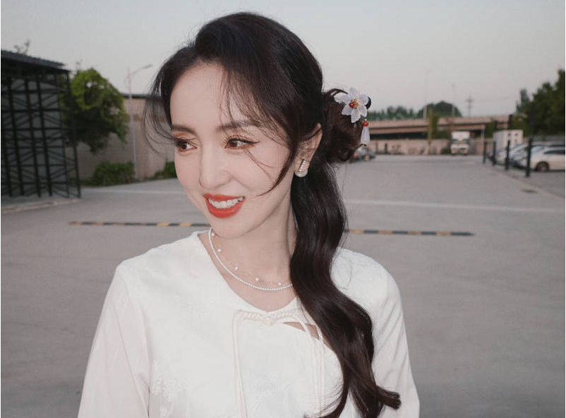 董璇一身白裙立于落日下 頭上簪花中式韻味十足