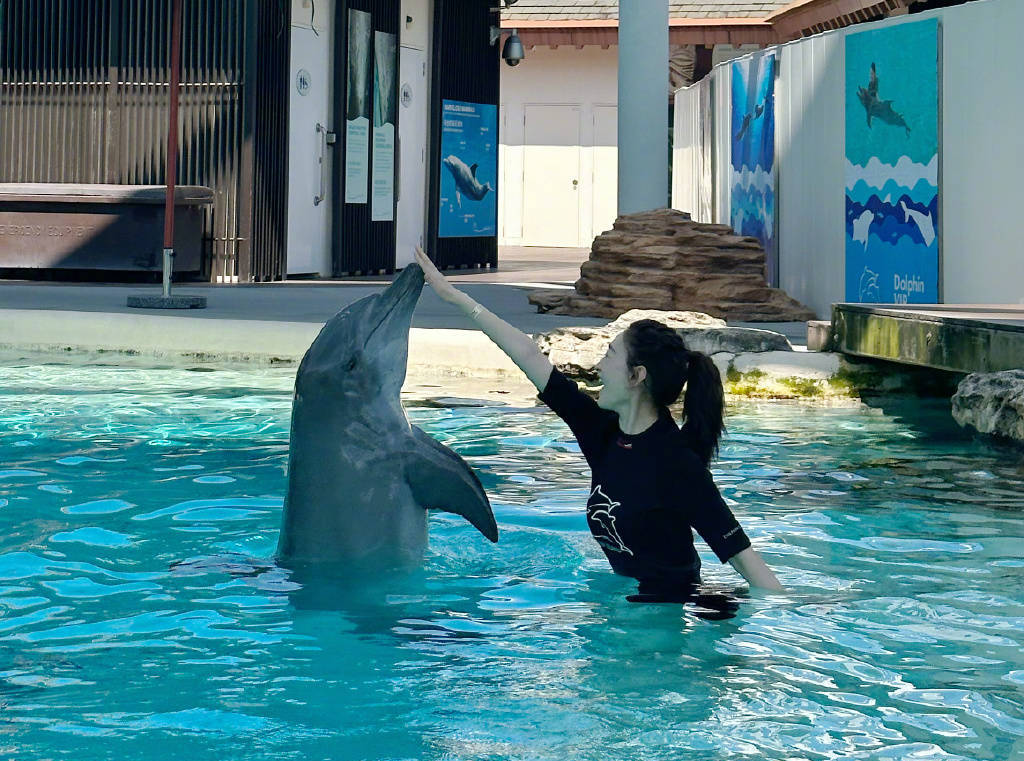 李小冉和海豚互動快樂有趣 扎高馬尾清純靈動