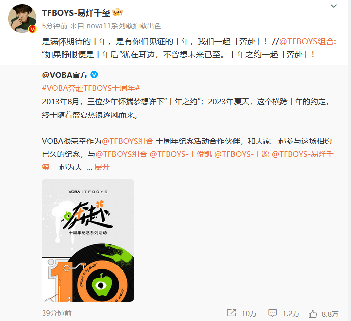 6月16日,TFBOYS(明星經(jīng)紀(jì)公司)十年之約紀(jì)念活動(dòng)官宣,王俊凱、王源、易烊千璽在社交平臺(tái)官宣TFBOYS十年之約,與三位少年奔赴十年之約!