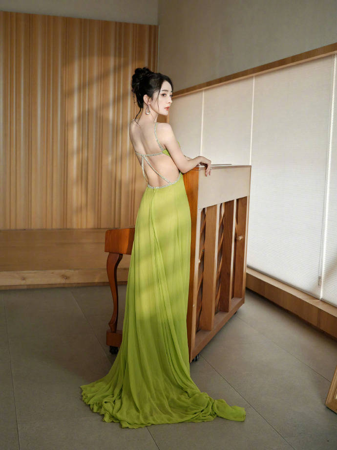 楊冪身著開衩綠裙亮相時尚活動 露背設(shè)計明媚性感