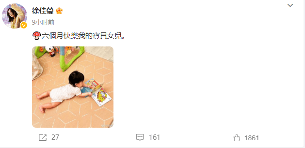6月18日凌晨,歌手徐佳瑩(明星經(jīng)紀(jì)公司)曬出二胎女兒趴在地上的照片,配文“六個月快樂我的寶貝女兒。”去年12月17日,徐佳瑩在個人社交平臺分享自己喜得二胎的消息。