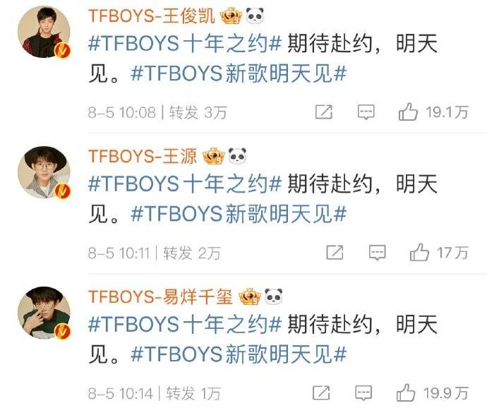 星全文化明星經(jīng)紀(jì)公司資訊:8月5日,TFBOYS發(fā)布新歌《明天見》,組合成員王俊凱王源、易烊千璽發(fā)布同款文案,表示期待赴約。