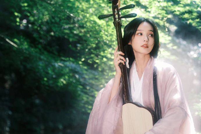 李一桐在林間抬頭仰望,美的直擊人心,果然樂器和美人就是一幅完美的畫卷!