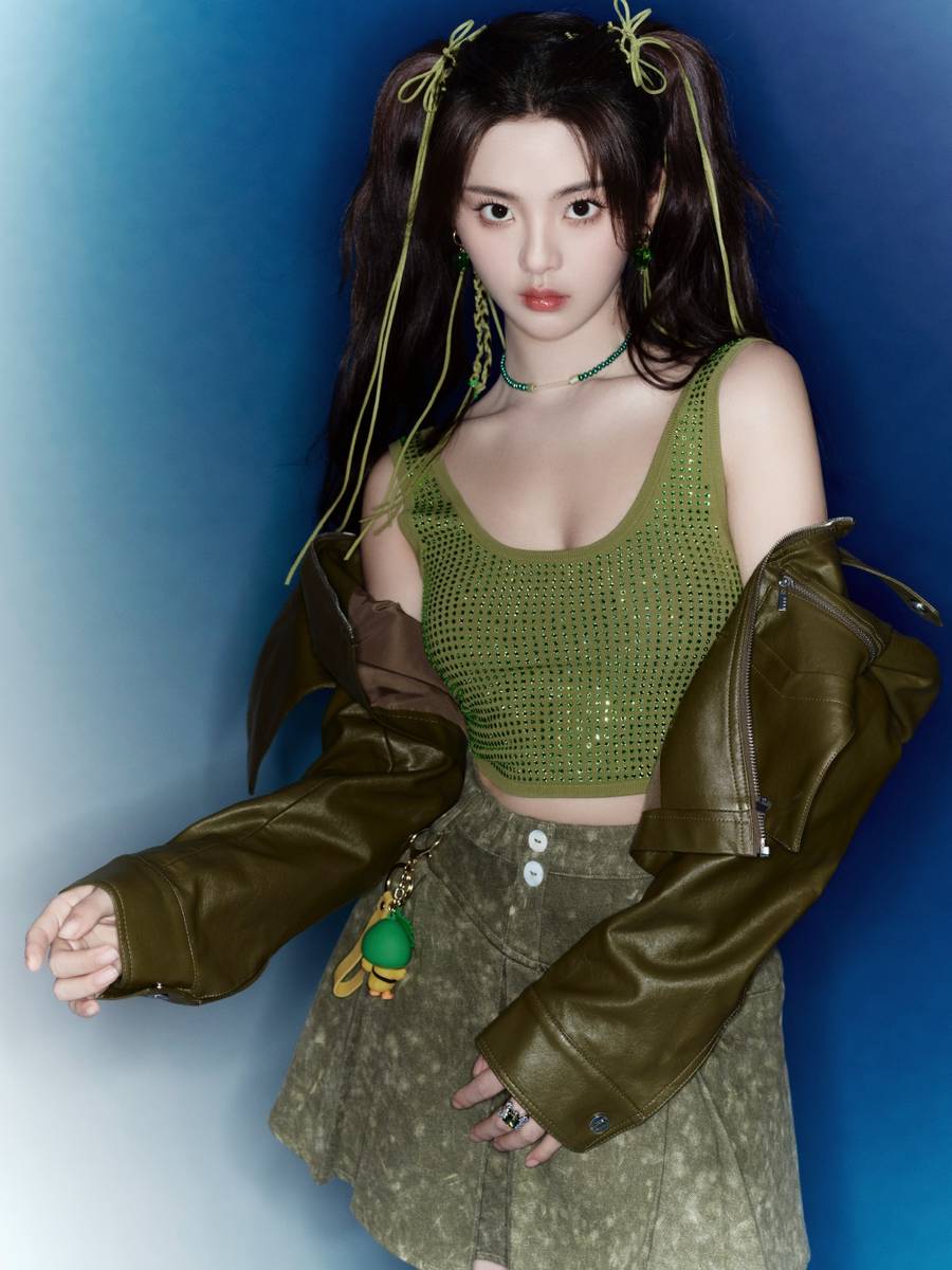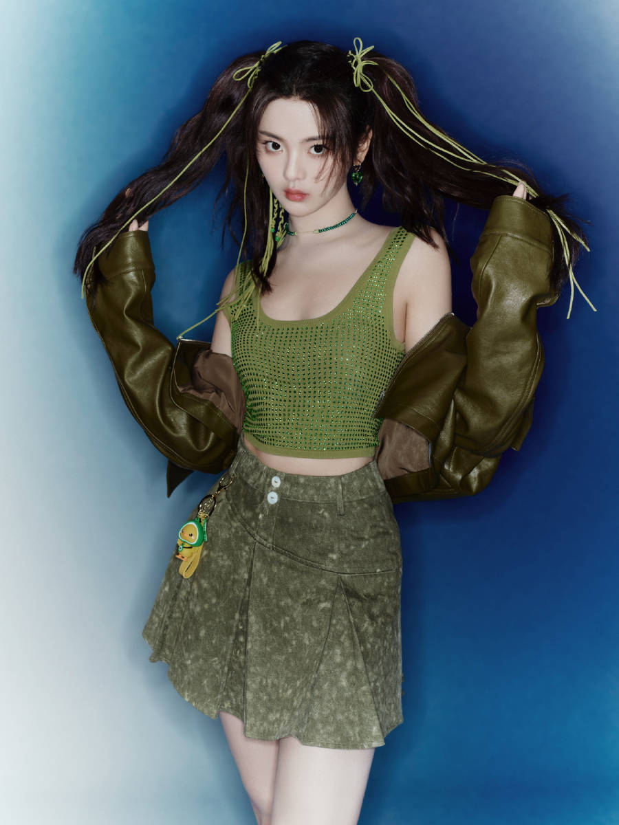 楊超越墨綠風穿搭甜美可愛 頭扎雙馬尾靈動輕盈