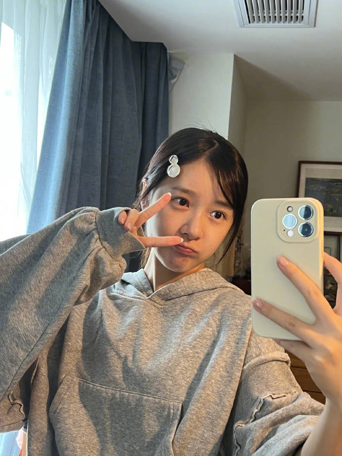 徐嬌對鏡自拍,素顏出鏡,比耶好可愛。