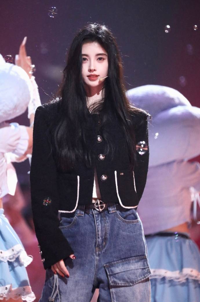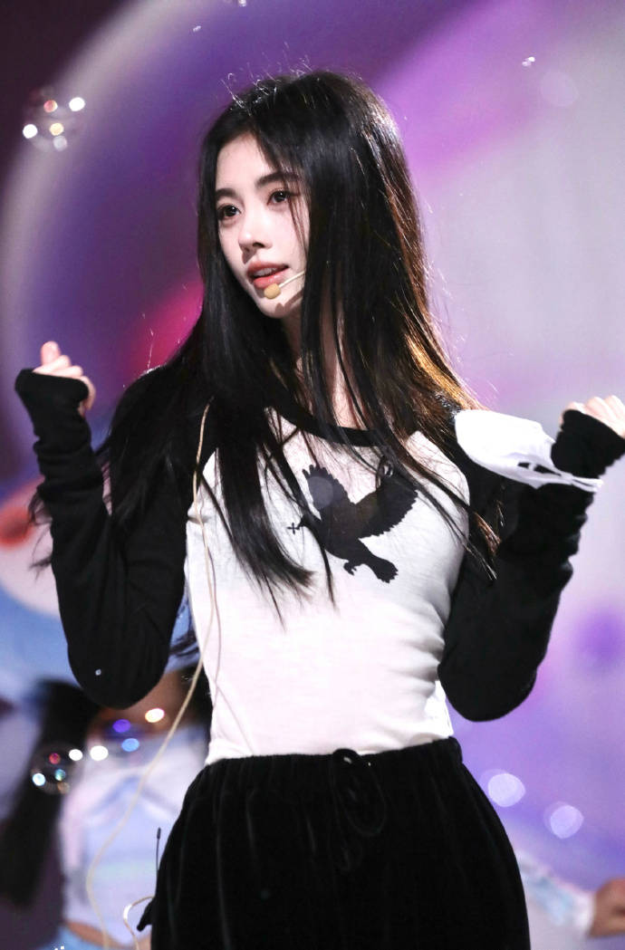 鞠婧祎黑發(fā)及腰清純大方。