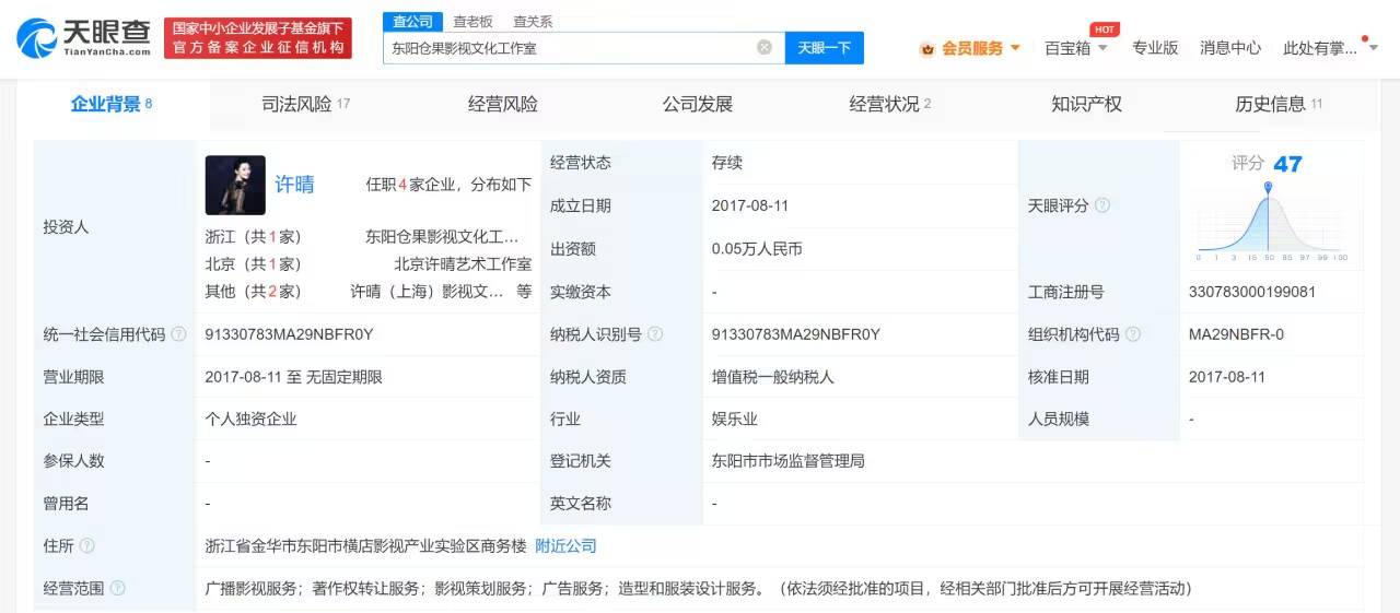 據(jù)悉,東陽倉果影視文化工作室成立于2017年8月,為許晴個人獨(dú)資企業(yè),經(jīng)營范圍含廣播影視服務(wù)、著作權(quán)轉(zhuǎn)讓服務(wù)、影視策劃服務(wù)、廣告服務(wù)、造型和服裝設(shè)計(jì)服務(wù)。目前,許晴名下共關(guān)聯(lián)4家企業(yè),除上述工作室外,其余3家已注銷。