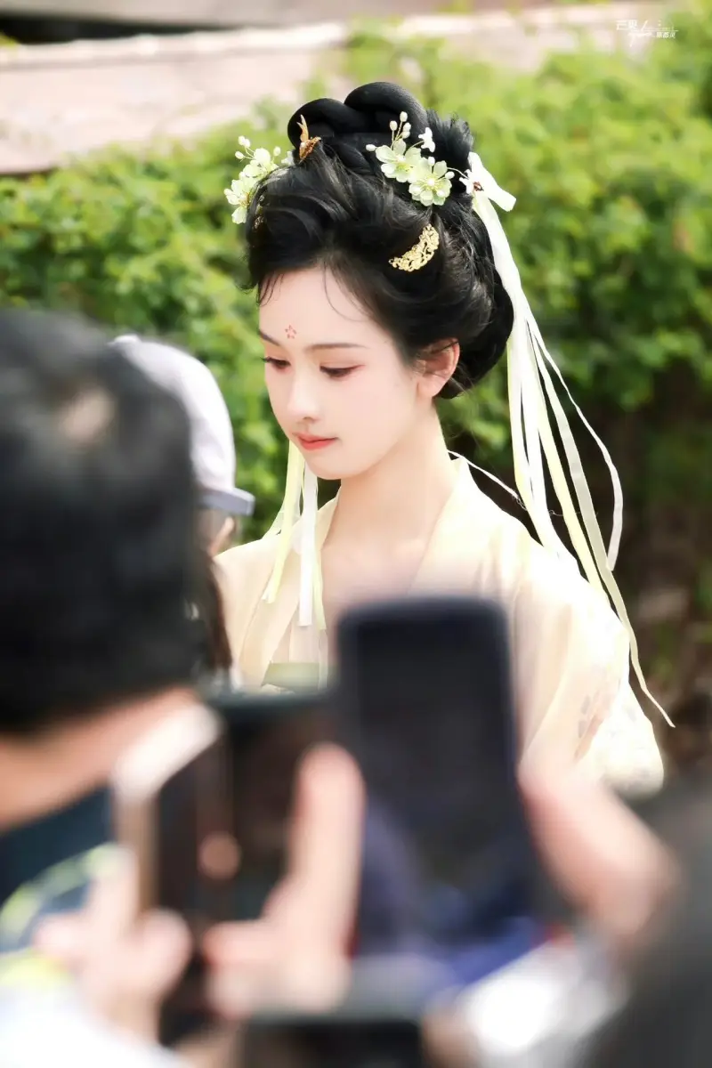 陳都靈穿嫩黃色唐制漢服,眉間花鈿盡顯柔美。