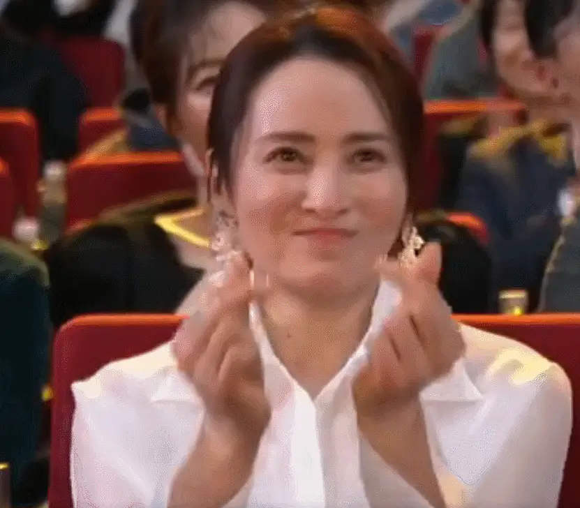 蔣勤勤聽完陳建斌為她寫的詩(shī)后,對(duì)著臺(tái)上的老公比心。