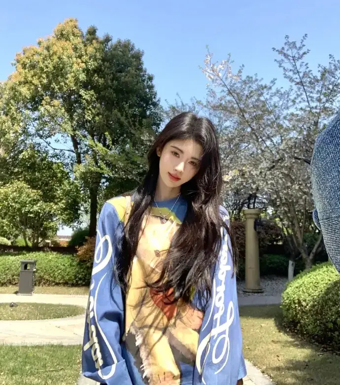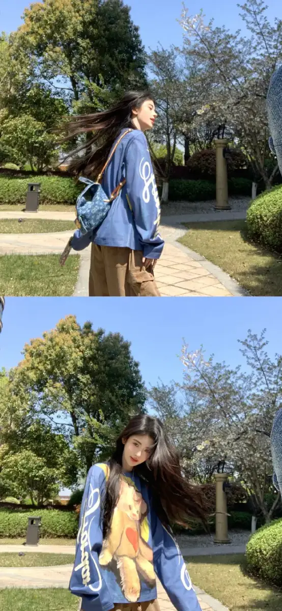 鞠婧祎藍(lán)色牛仔包配藍(lán)色衛(wèi)衣,十分青春。