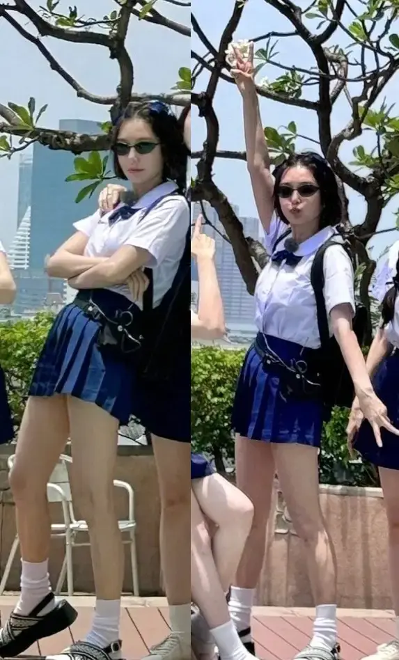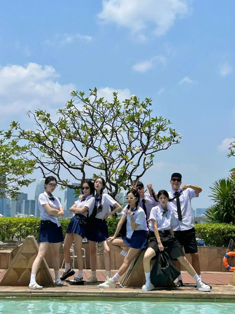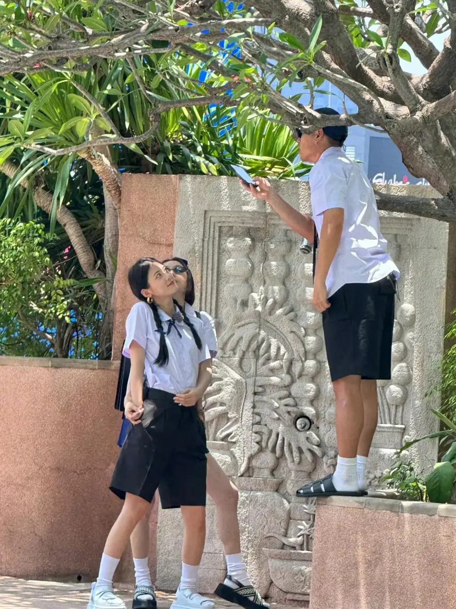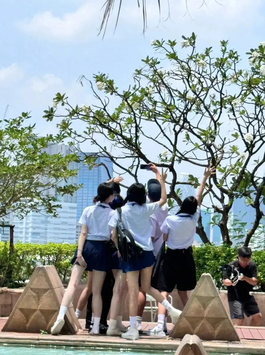 幾人自拍比耶,背影秀出修長(zhǎng)美腿,滿(mǎn)滿(mǎn)的學(xué)生氣息。