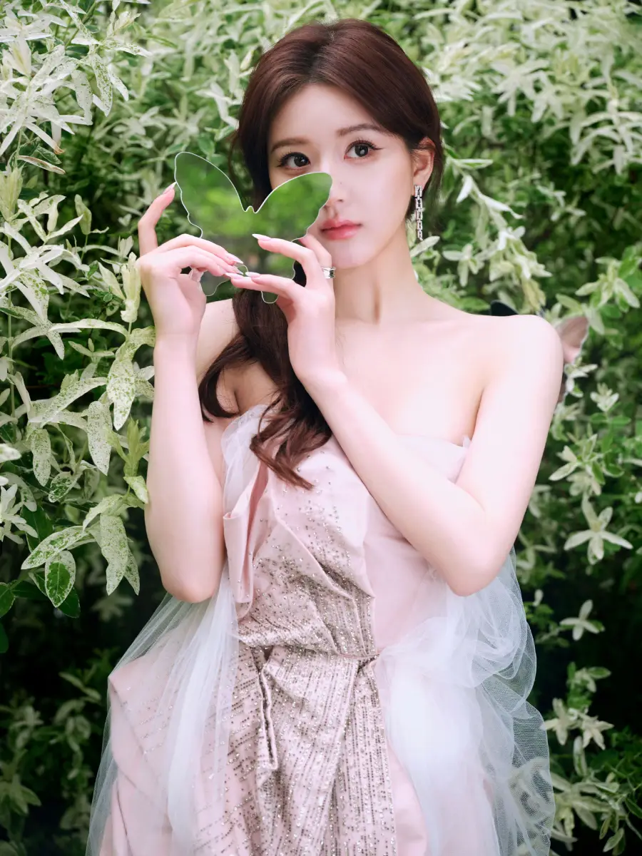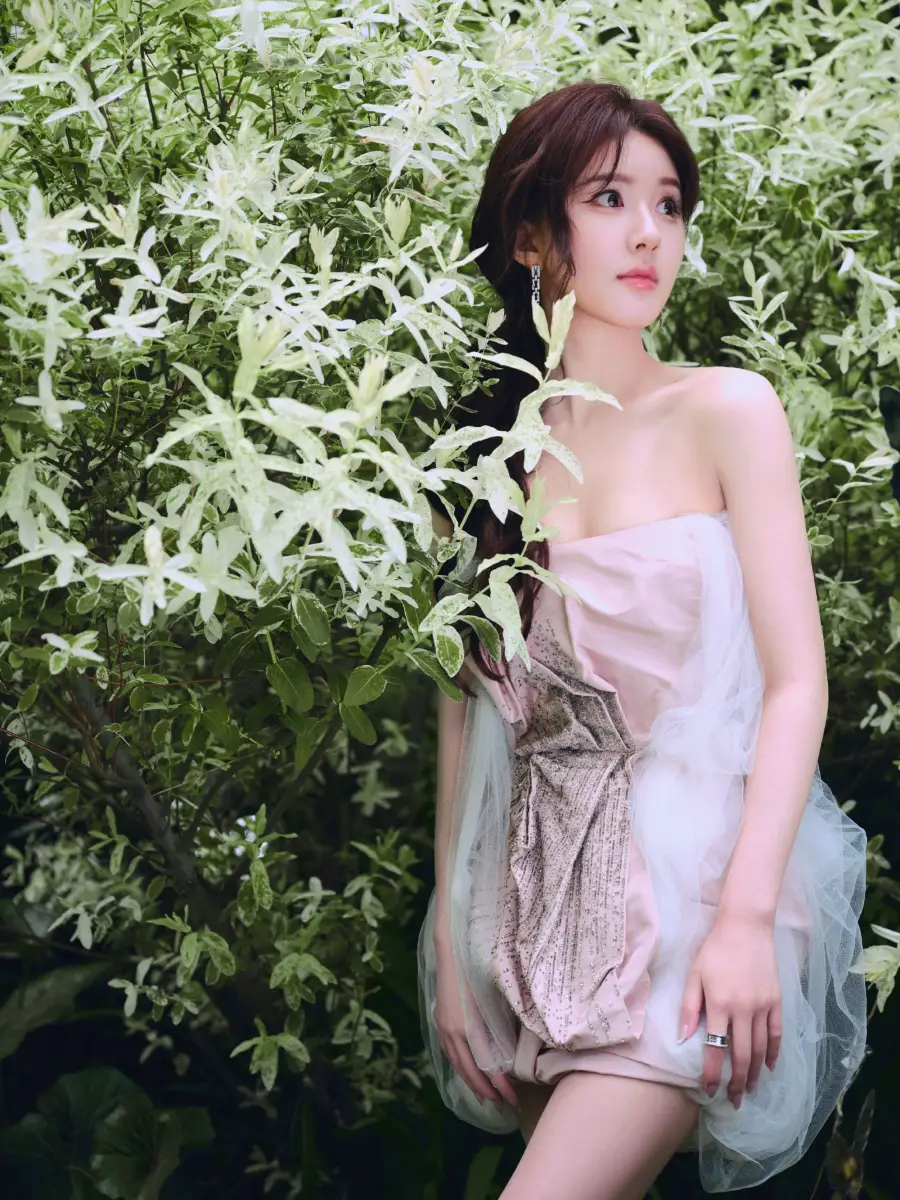 趙露思秀發(fā)披肩,漫步花園。