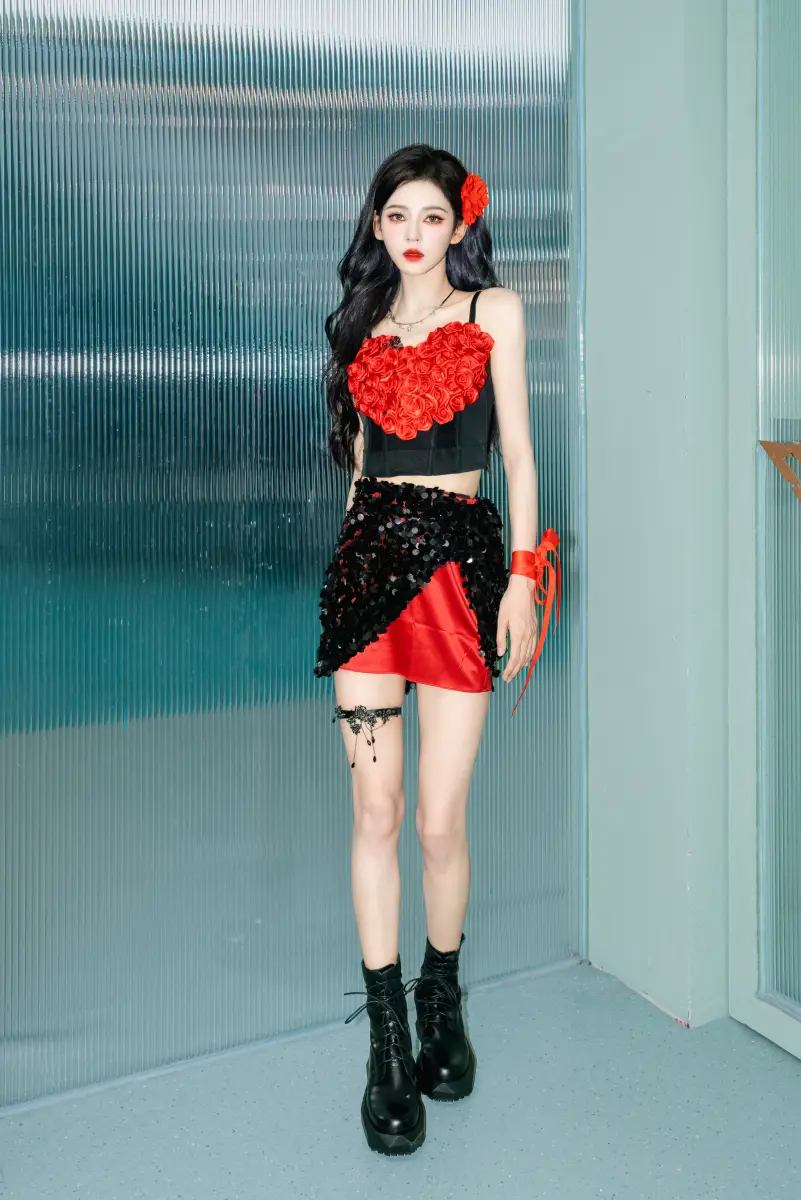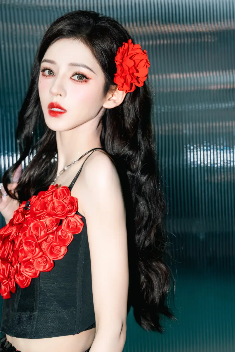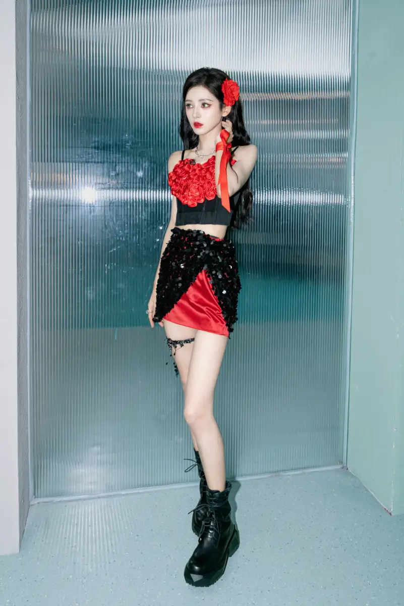 張予曦紅黑造型,發(fā)間別著一朵紅花,嫵媚動人。