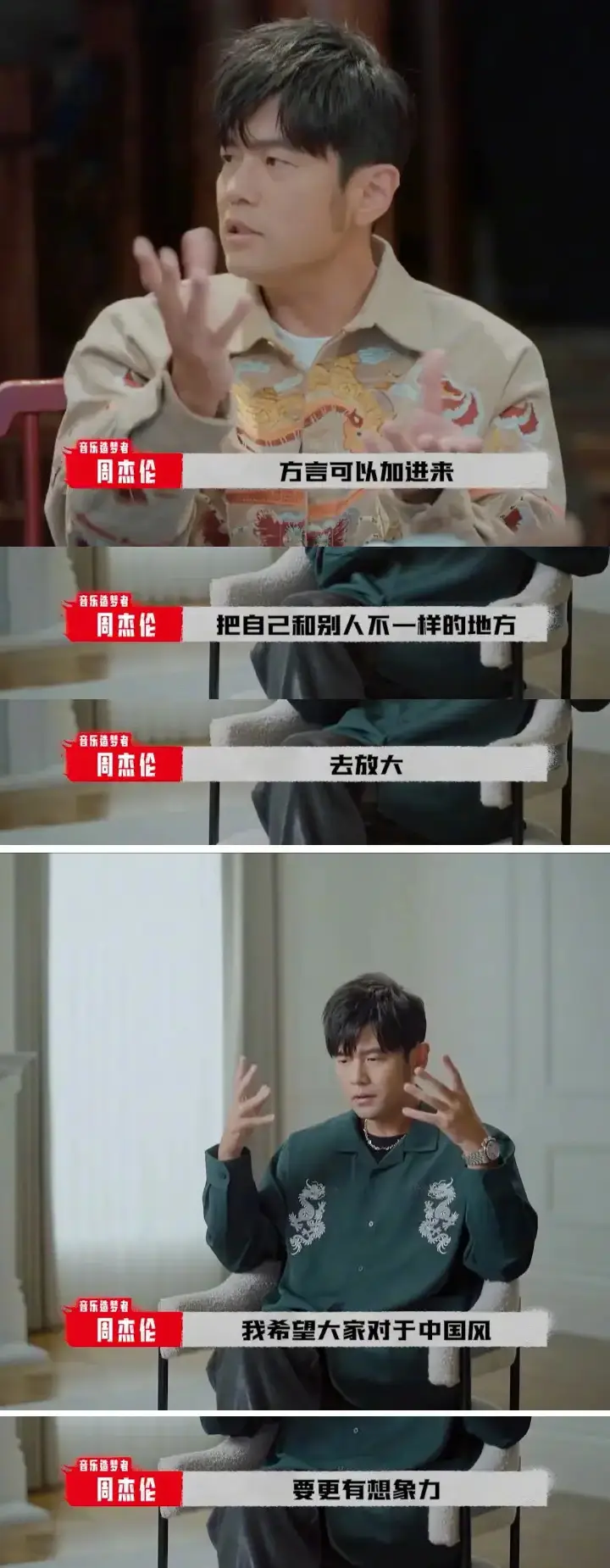 周杰倫還表示:“我希望大家對(duì)于中國(guó)風(fēng)要更有想象力,就是不只有歌詞上面,然后配樂上面,編曲上面,要怎么跟別人不一樣,要加怎么樣的民族樂器在里面,要怎么樣的方言在里面,可能一把吉他,簡(jiǎn)簡(jiǎn)單單的,它也可以是很有魅力的。”