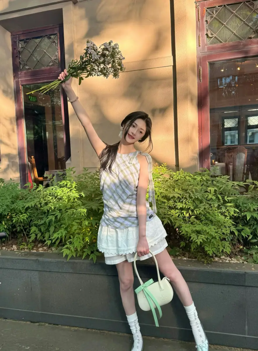 周潔瓊穿格紋背心配蕾絲短裙,太適合田園風(fēng)了。