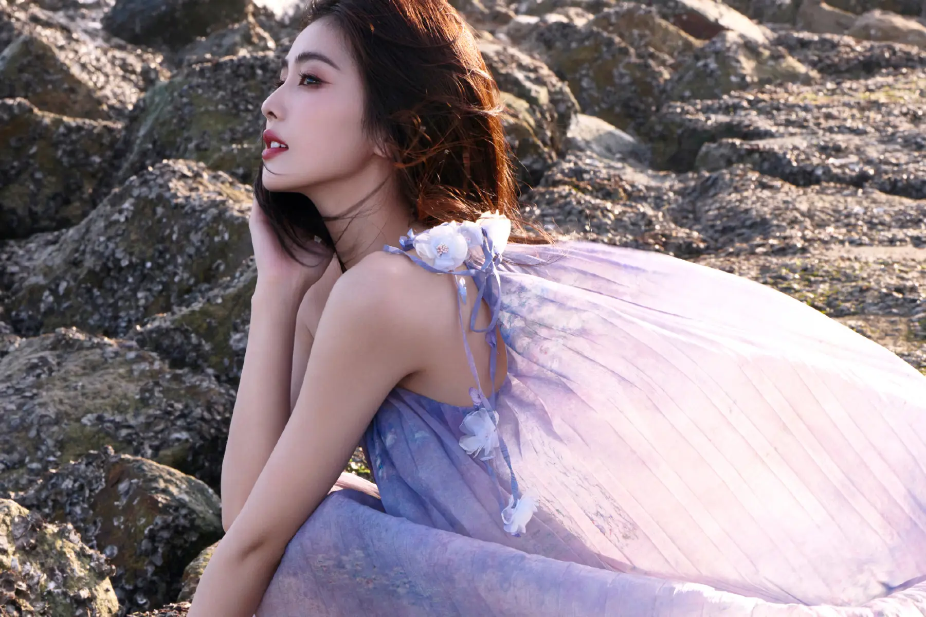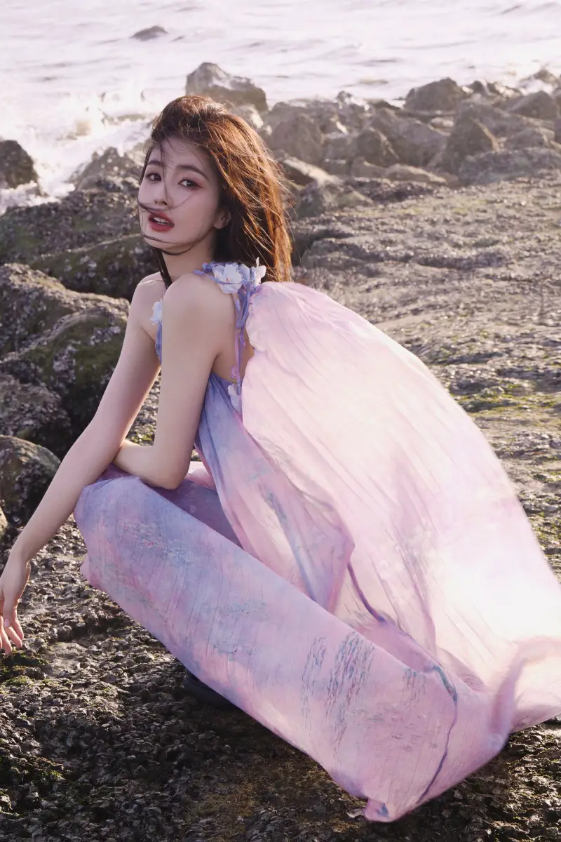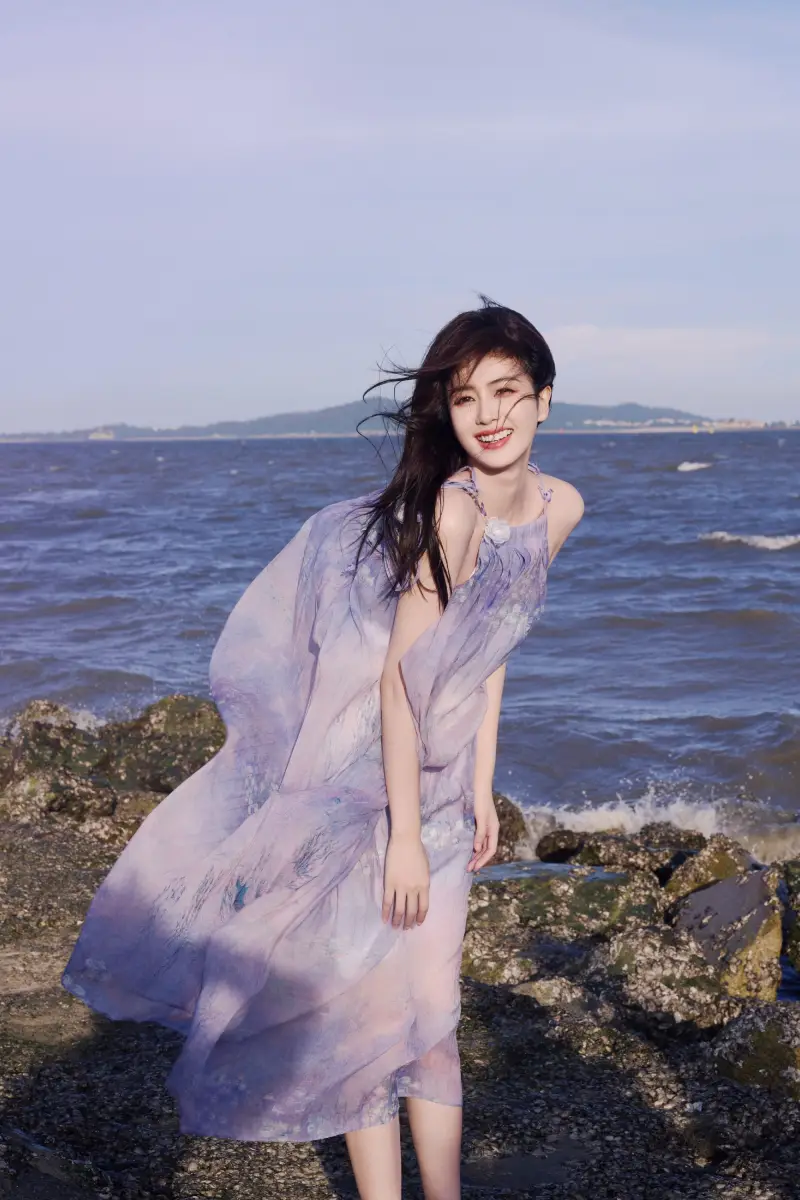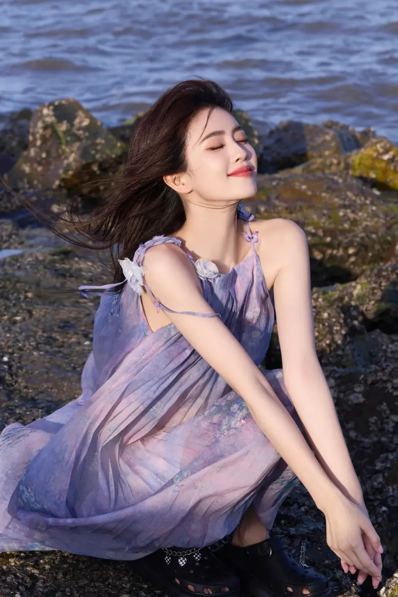 白鹿穿紫色紗裙海邊漫步 側(cè)身燦笑明媚如陽光