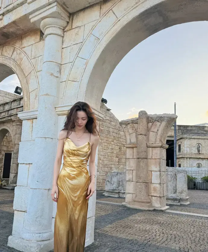 鐘楚曦穿金色吊帶裙漫步澳門 夕陽(yáng)下微笑氣質(zhì)卓越