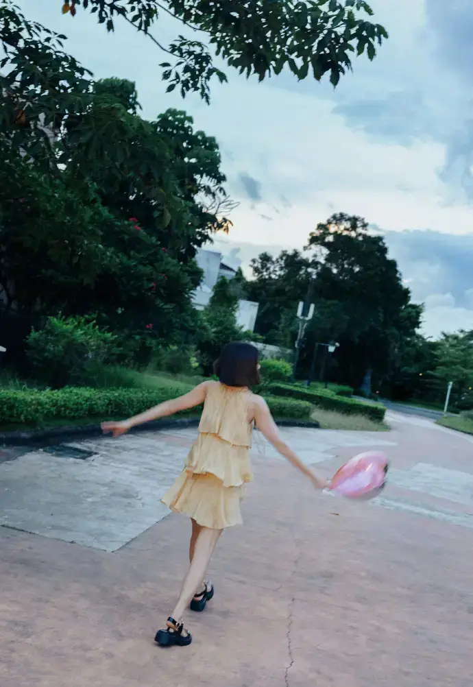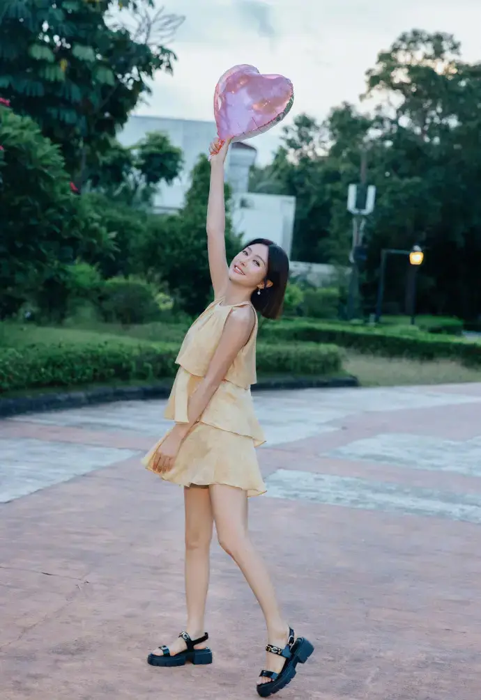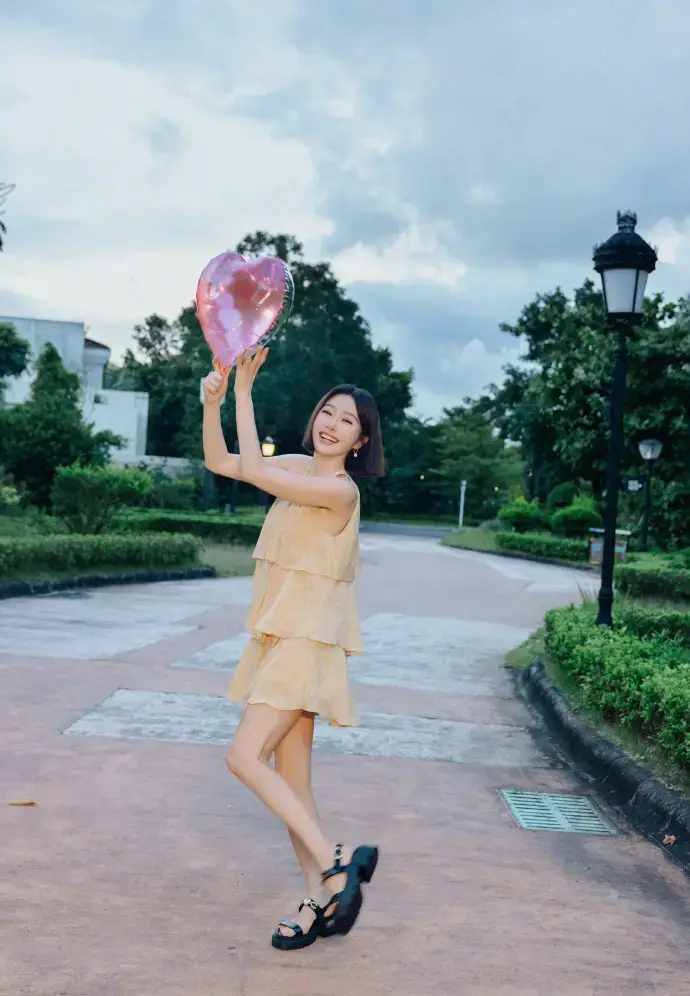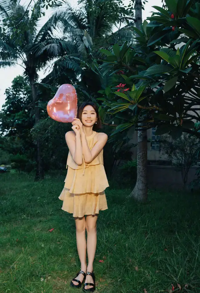 秦嵐穿嫩黃掛脖裙溫柔活潑 手拿愛心氣球笑容甜美