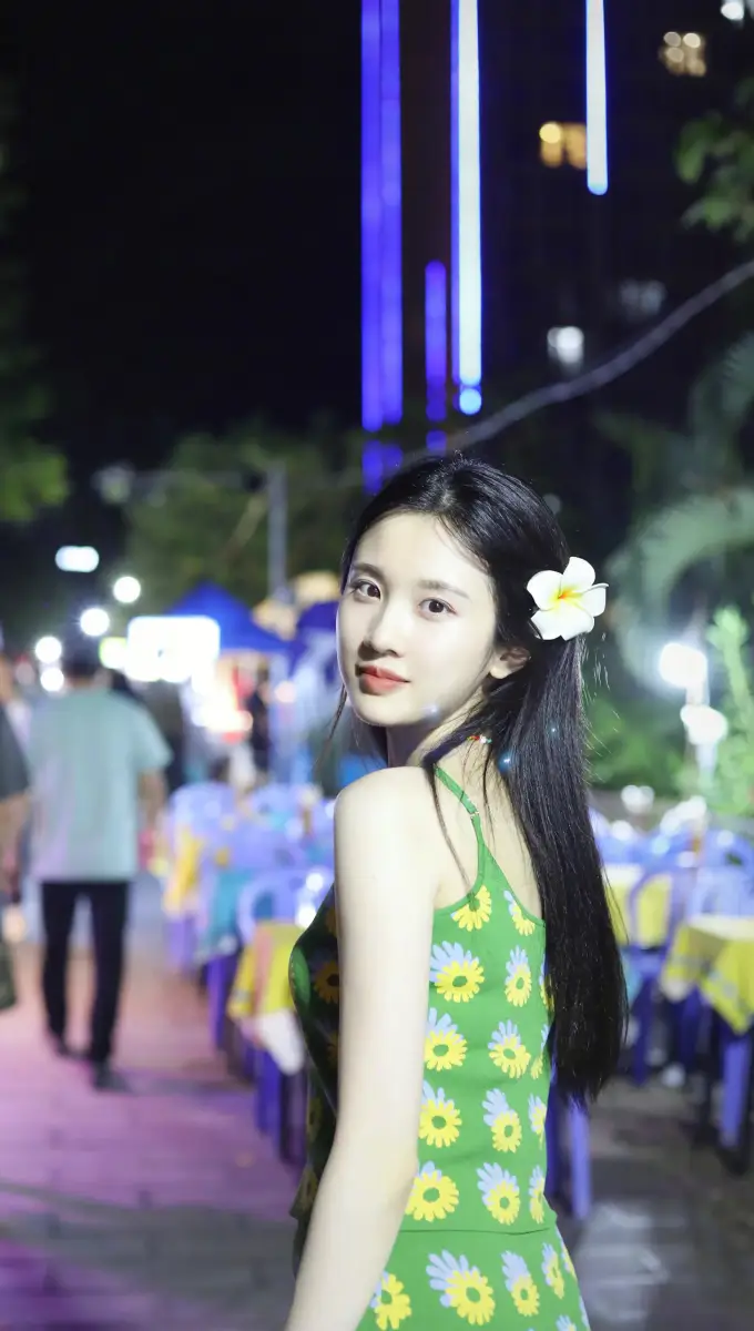 張慧雯雙馬尾穿印花裙清純俏皮 夜市玩樂活潑可愛