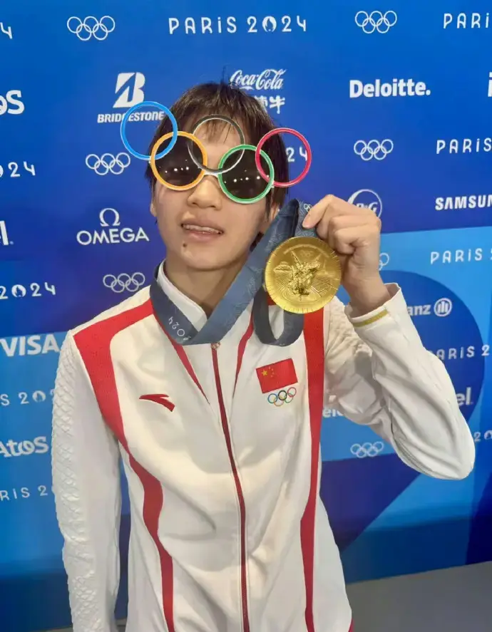 陳芋汐舉著獎(jiǎng)牌,擺出叉腰的姿勢(shì)非??蓯?ài)。