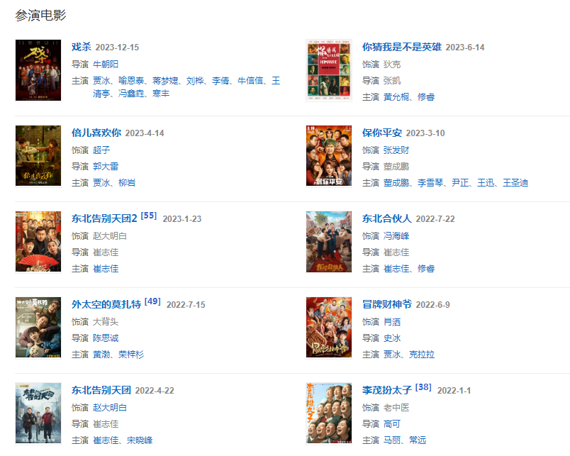202217日,在播出的綜藝《冰雪正當燃》里擔任節(jié)目嘉賓;  130日,參加《2022年遼寧衛(wèi)視春節(jié)聯(lián)歡晚會》。429日,參演的喜劇電影《保你平安》上映。422日,主演的喜劇電影《東北告別天團》上映。