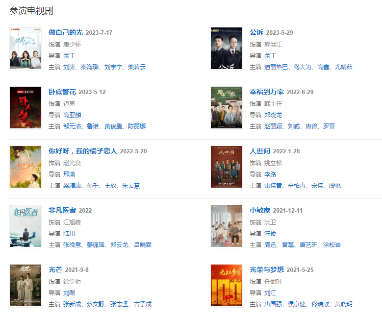 2022128日,參演的改編自梁曉聲原著的現(xiàn)實主義題材大劇《人世間》在央視一套和愛奇藝播出;629日,特別出演的現(xiàn)實題材電視劇《幸福到萬家》播出。