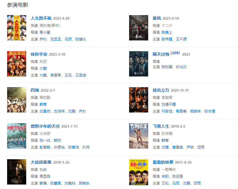代表作品:麻雀、夏洛特?zé)?、他來了,請閉眼、龍門鏢局、鬢邊不是海棠紅、揚(yáng)名立萬