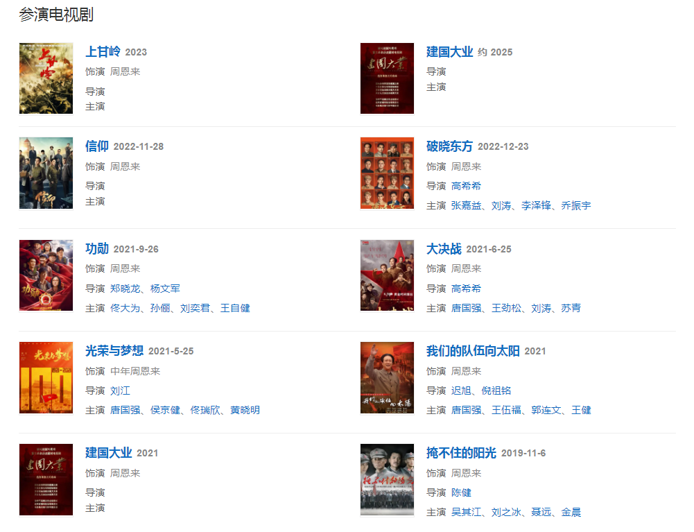 2000年主演電視劇《長征》,并且憑借其飾演的“周恩來”一角獲北京“電視劇輝煌30年”經(jīng)典熒屏形象獎。