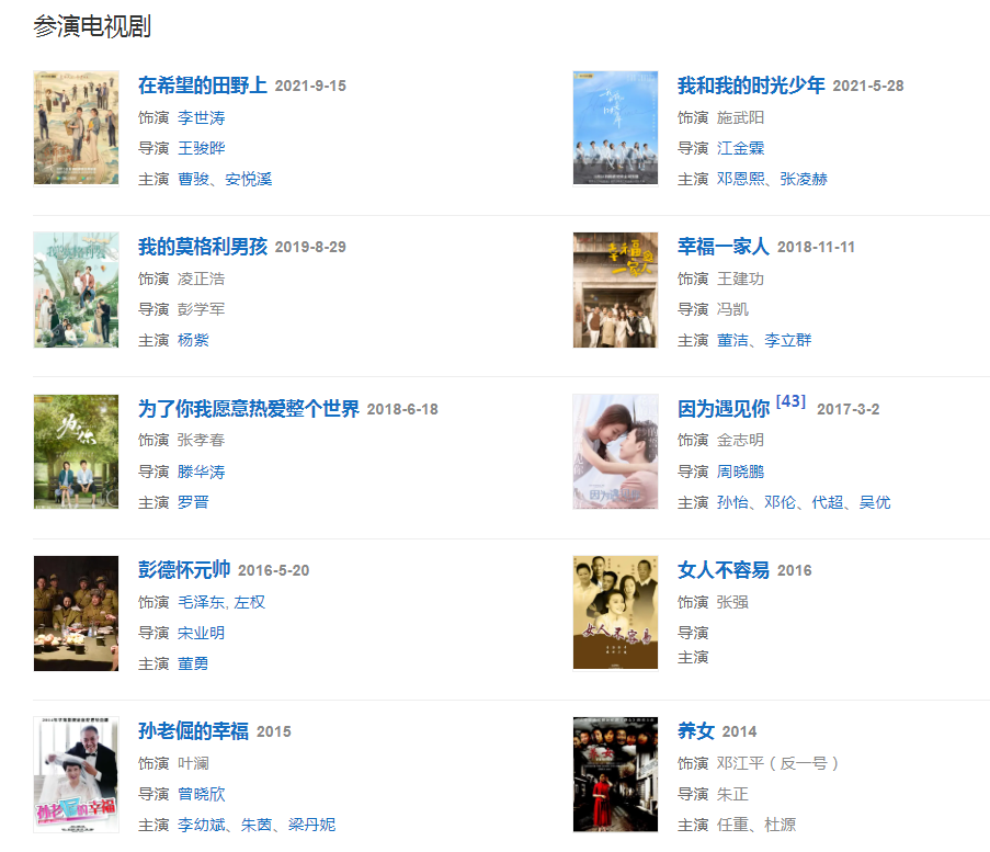 2018年在滕華濤指導(dǎo)電視劇《為了你我愿意熱愛(ài)整個(gè)世界》中,飾演張孝春;同年出演馮凱執(zhí)導(dǎo)的家庭劇《幸福一家人》。