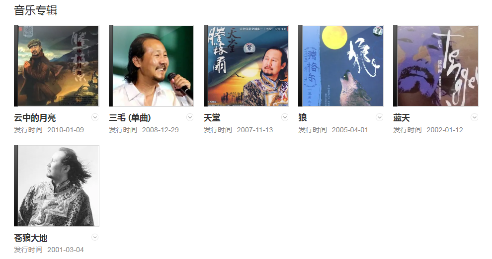 代表作品:天堂、天與地、唱給黃河聽(tīng)、蒙古人、大男人、桃花源、我熱戀的故鄉(xiāng)、嘎達(dá)梅林、蒼狼大地、八千里路云和月、雙城計(jì)中計(jì)