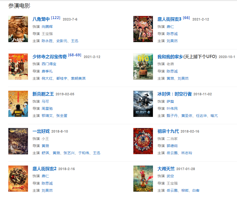 2015年,主演了陳凱歌執(zhí)導(dǎo)的奇幻片《道士下山》;12月,主演喜劇片《唐人街探案》。