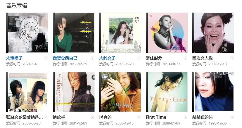 代表作品:相見恨晚、舊夢(mèng)、大齡女子、回味、我想念我自己、走在紅毯那一天、喜歡兩個(gè)人、敲敲我的頭、太難唱了