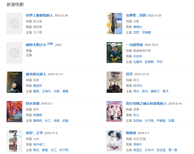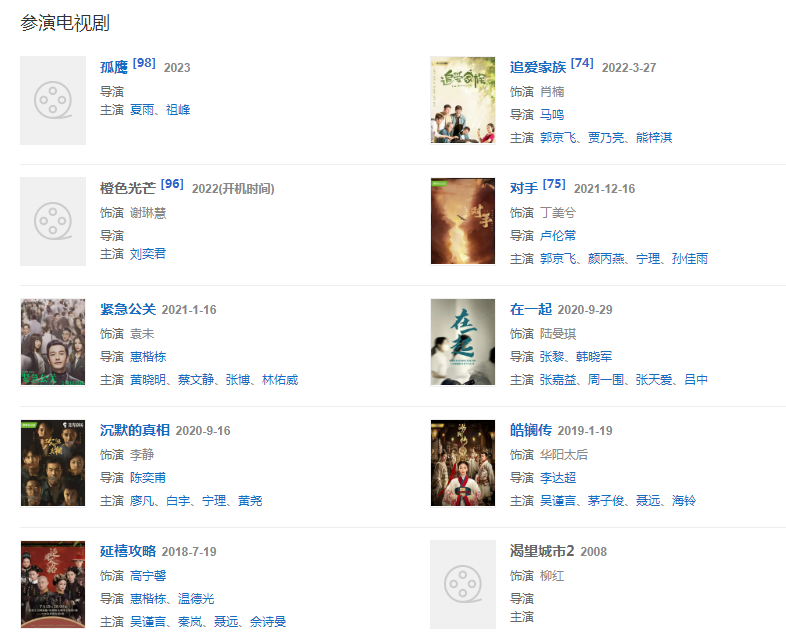 代表作品延禧攻略、皓鑭傳、春風(fēng)沉醉的夜晚、我不是藥神、HELLO!樹先生、暴裂無聲、追兇者也
