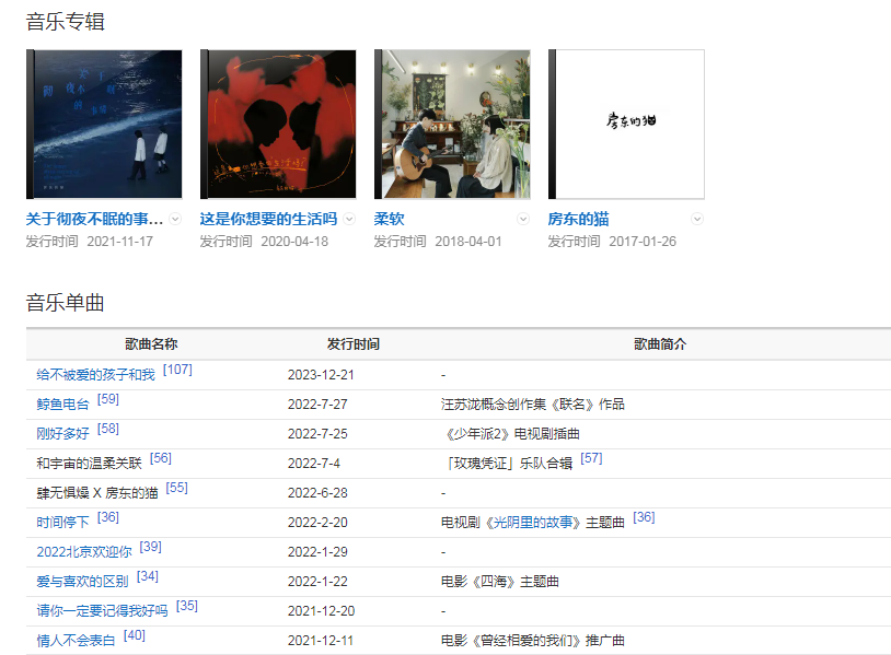 2017年,推出組合首張同名專輯《房東的貓》 ;同年,為動漫番劇《我是江小白》演唱片尾曲《云煙成雨》 。