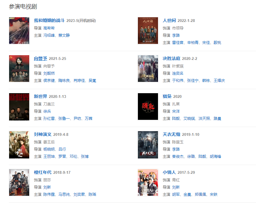 代表作品:孝莊秘史、康熙秘史、大清后宮之還君明珠、人民的名義、封神演義、新世界、決勝法庭、獵梟、向警予