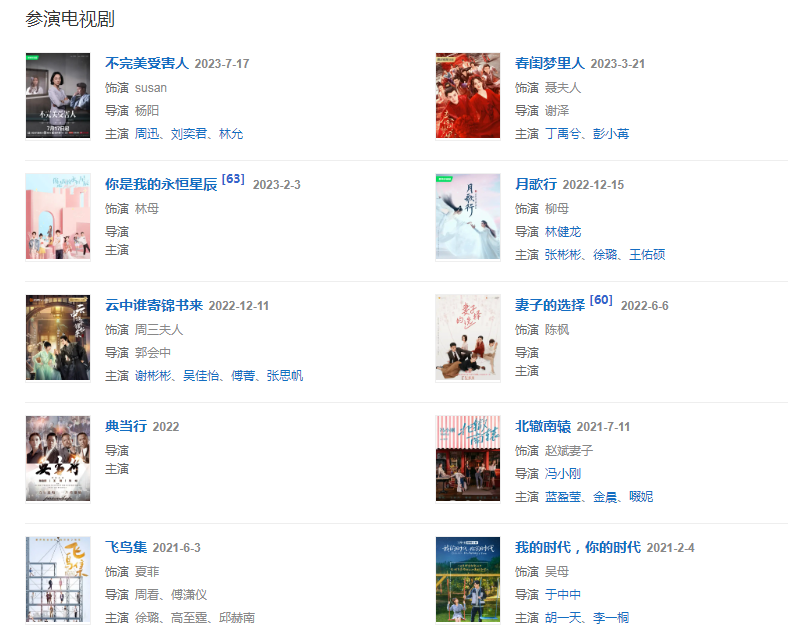 2021年6月3日,出演的青春能量劇《飛鳥集》在騰訊視頻和芒果TV播出,在劇中飾演夏菲;同年,出演胡一天、胡冰卿主演的《暗戀橘生淮南》,飾演盛淮南媽媽,在電視劇《我的時(shí)代,你的時(shí)代》飾演吳白媽媽; 7月11日,參演的電視劇《北轍南轅》播出。