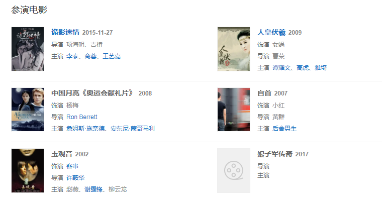 2003年在電視劇《萍蹤俠影》中扮演靜公主; 《李衛(wèi)當(dāng)官2》中扮演岳思盈;