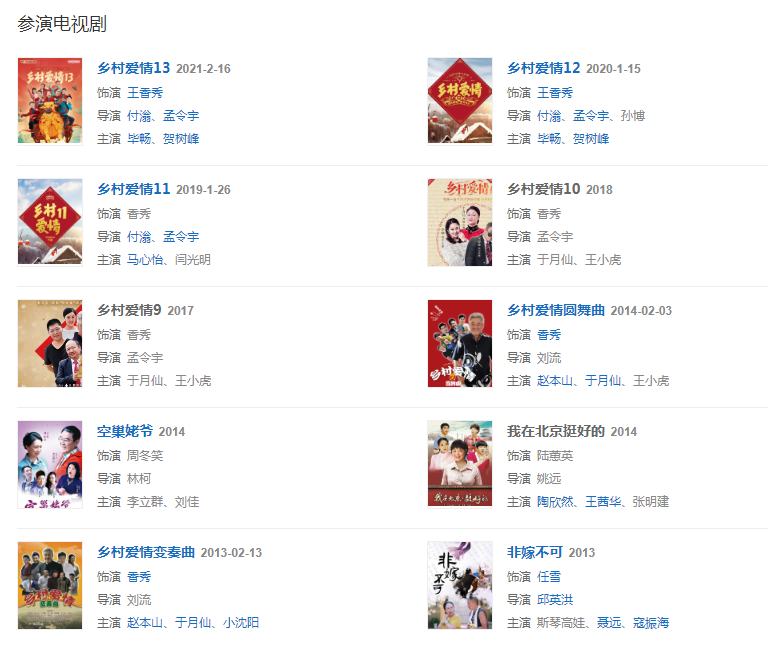 2008年參演電視劇《鄉(xiāng)村愛情2  ;2009年參加拍攝欄目劇《本山快樂營》;